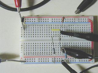 まずは、ブレッドボード上で基本回路を組み実験する事にしました。 トンネルダイオードを壊さないようにR1を選んで電圧を加えていきます。 |