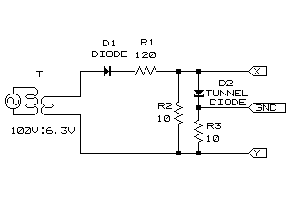 最終的な回路図は左のような回路図になりました。 トンネルダイオードは1S1763を使いました。 と言うかこれしか手に入りませんでした。 特性からもわかるように、電圧0.5V以下ー電流10mA以下の世界ですので、加える電圧、電流は小さくしないと壊れてしまいます。 そこで、トランスは電圧が低く、小型の物(6.3V:0.18A)にしました。 整流用ダイオードは、トランスの出力を半波にして、電圧0−9V(最高電圧6.3Vx√2≒9V)が加わるようにしています。 そして、R1とR2でトンネルダイオードに加わる電圧と電流を調整しています。 トンネルダイオードに直列につながれているR3は、トンネルダイオードに流れている電流を電圧に変換してオシロスコープに表示するための物です。 オシロスコープには、X軸が電圧、Y軸が電流のグラフがあらわれます。 |