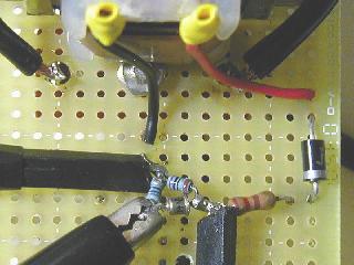 リード線を短くしていきましたが、ブレッドボード上では、いくら短くしてもこの途切れた部分はつながりません。 そこで、基板上に組んでみました。ブレッドボード上よりは良いようですが、まだグラフは途切れています。 抵抗を1/8Wに変えてもまだ線がつながりません。 最後の手段として、写真のように直接部品通し半田付けしたところ、やっと破線部分がつながりました。 |