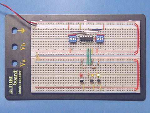 | 4ビットの2進数を簡単に比較できるコンパレータ、74LS85の機能確認実験をしました。 74LS85は、4ビットの入力A、入力Bの値を比較し、大小に応じて、比較出力、A>B、A=B、A<Bに「H」を出力します。 上の写真では、左のスイッチがA入力、,右のスイッチがB入力、LED赤・黄・緑が出力A>B、A=B、A<Bです。 また、単体では4桁までの比較しか出来ませんが、もっと桁数を増やしたい場合は、下の桁からの比較出力を、比較入力に接続することで容易に桁を増やせます。 |