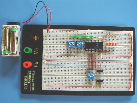 | ALUとは、「ALITHMETIC・LOGIC・UNIT」の略で、論理演算と算術演算が出来ます。 74181は、その昔ロジックICを組合せて作られたミニコンピュータの演算ユニットに使われました。 その機能は真理値表のように豊富です。 大まかに、 M=H:論理演算 M=L,Cn=L:キャリー無し算術演算 M=L,Cn=H:キャリー付き算術演算 ができ、S0〜S3を変更する事で、それぞれ16通りの演算が可能です。 (写真は74LS181ですが、同じ機能で、ノーマルTTLの74181やCMOSの14581、HCMOSの74HC181などがあります。スイッチからの入力を正常に認識させるため、これらのICでは、プルアップ・プルダウンに使っている集合抵抗の値を、ノーマルTTLでは、より小さい値に、HCMOSでは逆に大きい値に変更する必要があるかもしれません。) |