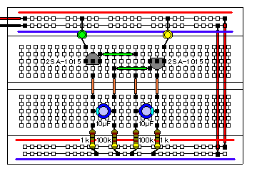電源を入れると、各LED、PNPトランジスタのエミッタ、ベースを通り、電流が流れていきます。 この時、全ての部品の定格が同じでも、LEDの順方向電圧、トランジスタの特性のバラツキ、抵抗、コンデンサの値の誤差などで流れやすさに差が出ます。 流れはじめは、電流は僅かで、どちらのトランジスタもオン(導通)状態にはありません。 (※実験ではLEDに黄と緑を使用しているので、順方向電圧に差がありますが、説明がわかりにくくなりますのでここでは赤色LEDを2個使う場合で説明していきます。) |