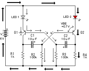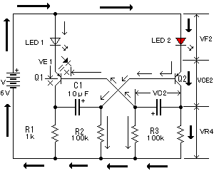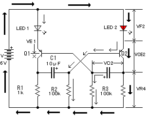 トランジスタQ2のベース電圧が、先に0.7Vを越えたとします。 すると、トランジスタQ2のエミッターコレクタ間がオン(導通)状態になり、先にLED 2が点灯します。 |