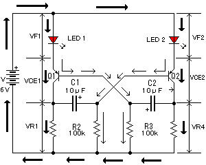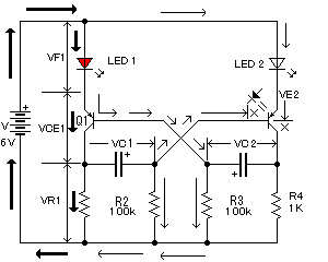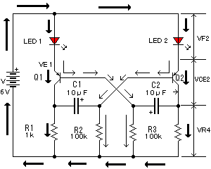 抵抗R1の電圧が上がると、コレクタと抵抗R1の間から反対側のトランジスタQ2のベースにつながっているコンデサC1の電圧が押し上げられます。 この時、コンデンサC1にはそれまでに蓄えられた電気があり、これに上昇した抵抗R1の電圧VR1を加えると、一瞬、電源電圧Vを越えるほど高くなります。 するとオン(導通)状態でLED 2を点灯させていたトランジスタQ2のベースに逆方向に電圧が加わり、一瞬でトランジスタQ2をオフ(不通)状態にし、LED 2を消灯させます。 また、電源に向かって電気が流れようとしますが、トランジスタQ2のエミッターベース間は構造的に一種のダイオードので、電流はトランジスタQ2のベースでとめられます。 当然、トランジスタQ2がオン(導通)状態になるのに必要なベース電圧0.7Vとは、逆方向に電圧が加わりますので、トランジスタQ2は完全にオフ(不通)状態になります。 VE2<(VC1+VR1) |